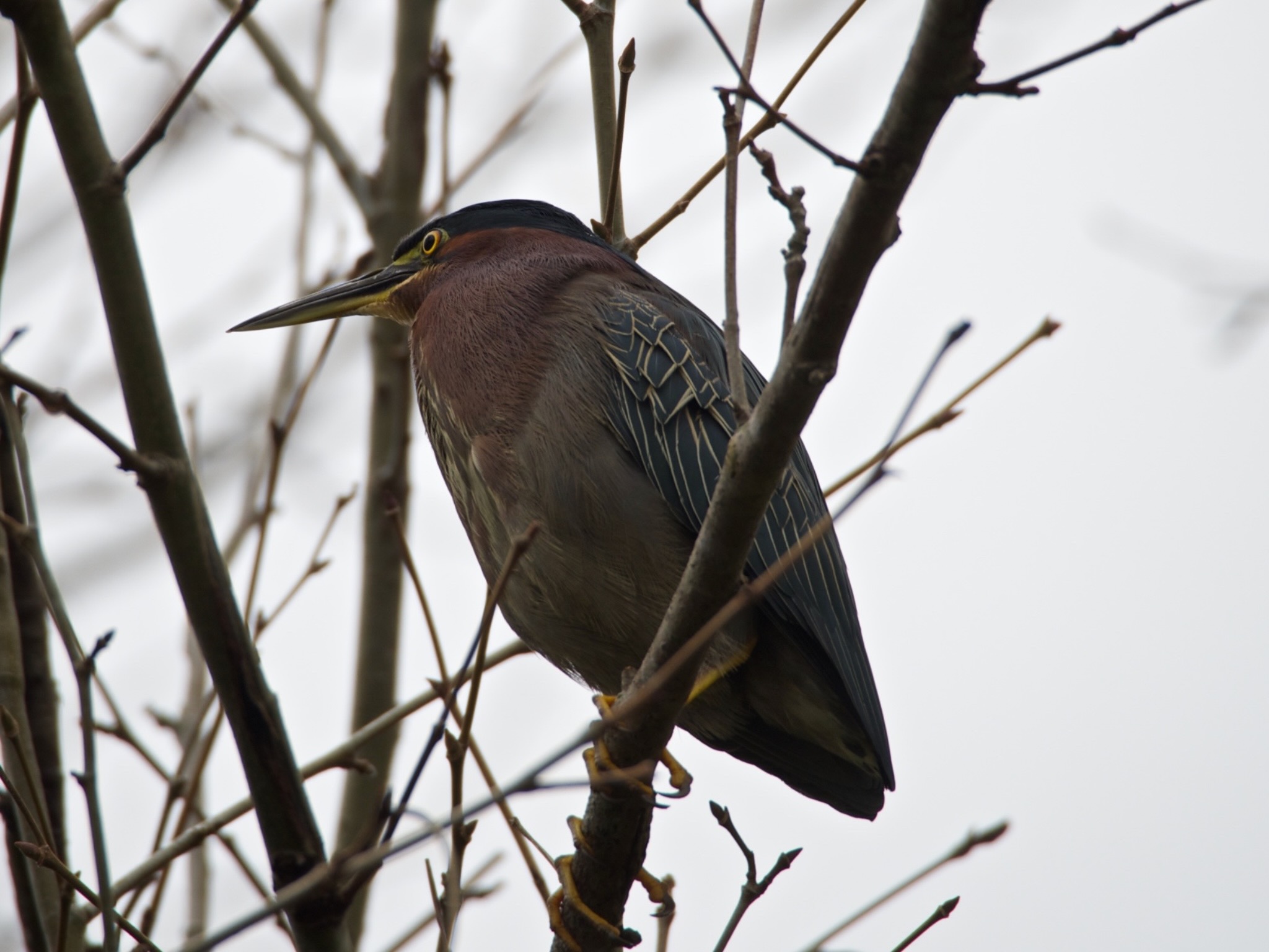 I was startled by a Green Heron who was apparently startled by me. He flew by and landed in a tree. A lot of branches in the way, but I managed to get a shot or two.